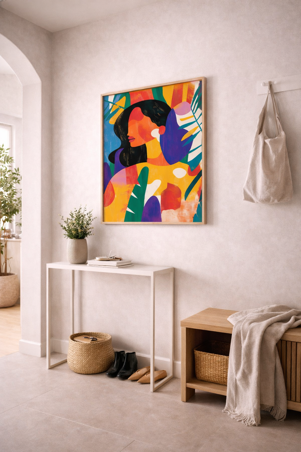 Cette œuvre contemporaine met en scène un portrait féminin stylisé aux couleurs vibrantes et joyeuses. Les formes fluides et la palette lumineuse apportent énergie, modernité et créativité à votre intérieur. Idéale pour une entrée, un salon ou un espace de vie, Éclat Féminin devient une pièce forte qui dynamise la décoration tout en restant élégante et chaleureuse.