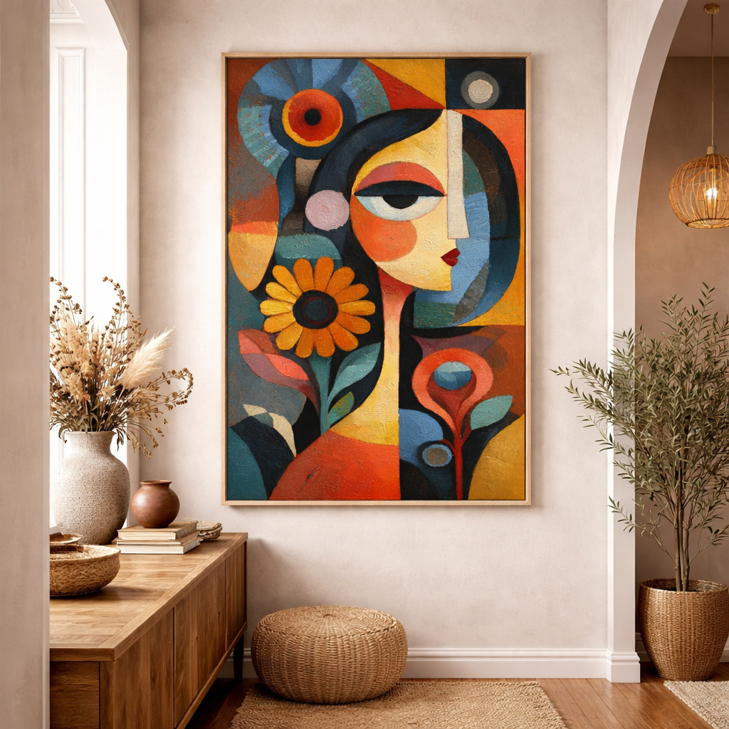 Cette œuvre expressive met en scène un visage féminin stylisé, entouré de formes florales et géométriques aux couleurs chaudes et vibrantes. Le mélange harmonieux de tons ocre, bleu et terracotta apporte une touche artistique forte et lumineuse. Idéale pour une entrée, un salon ou un espace de vie, Femme en Couleurs insuffle caractère, créativité et chaleur à votre intérieur.