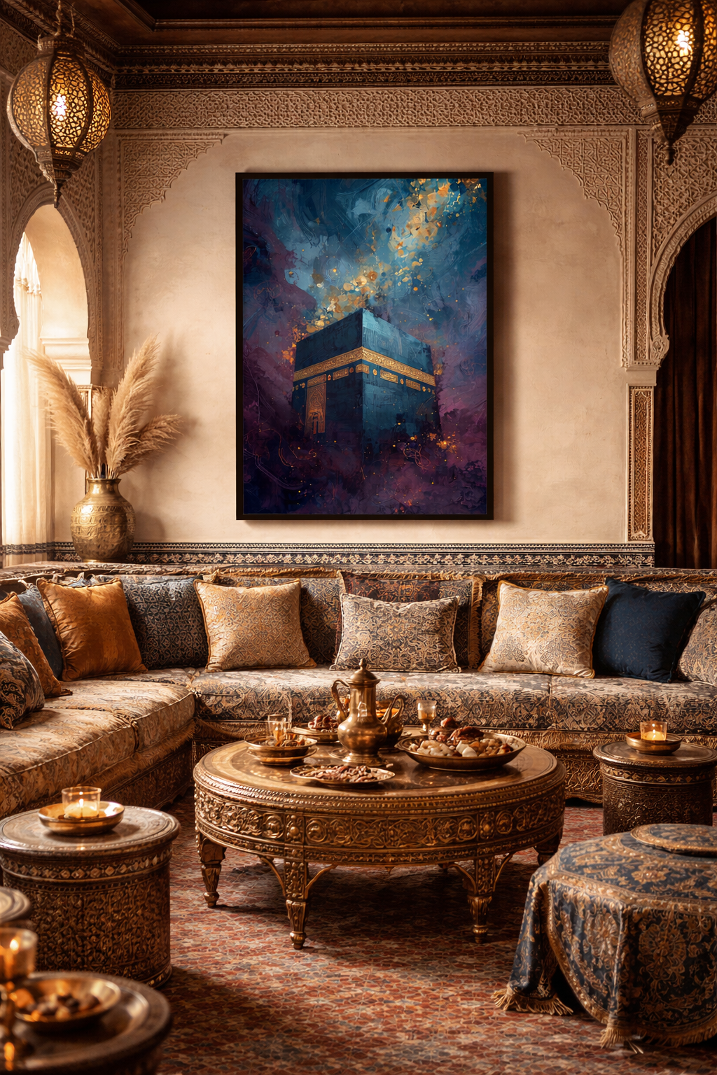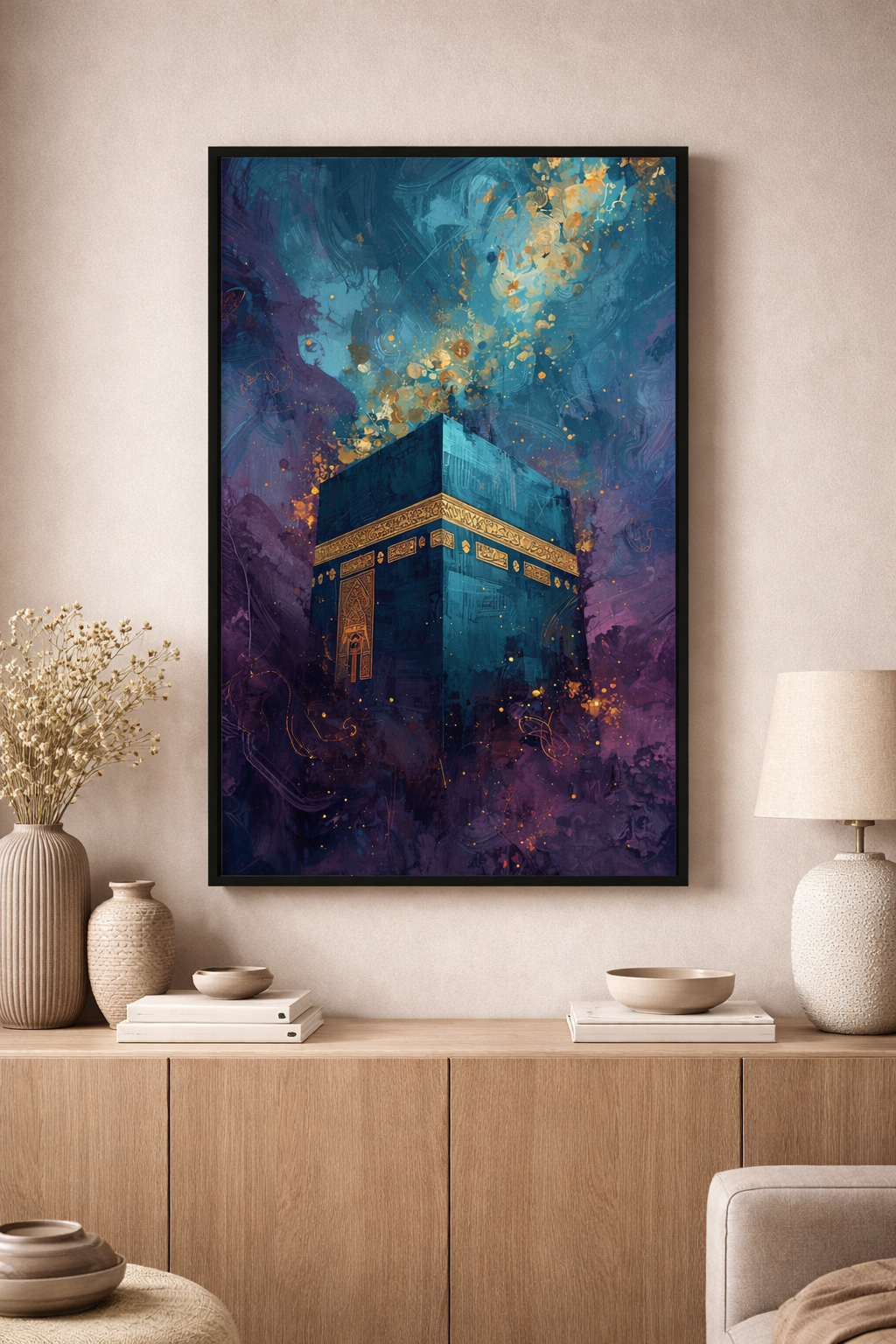 Cette œuvre contemporaine met en lumière la majesté de la Kaaba à travers une palette profonde de bleus et de violets, sublimée par des touches dorées lumineuses. Elle crée une atmosphère à la fois spirituelle et moderne, apportant calme, élégance et profondeur à votre intérieur. Parfaite pour un salon, un espace de prière.