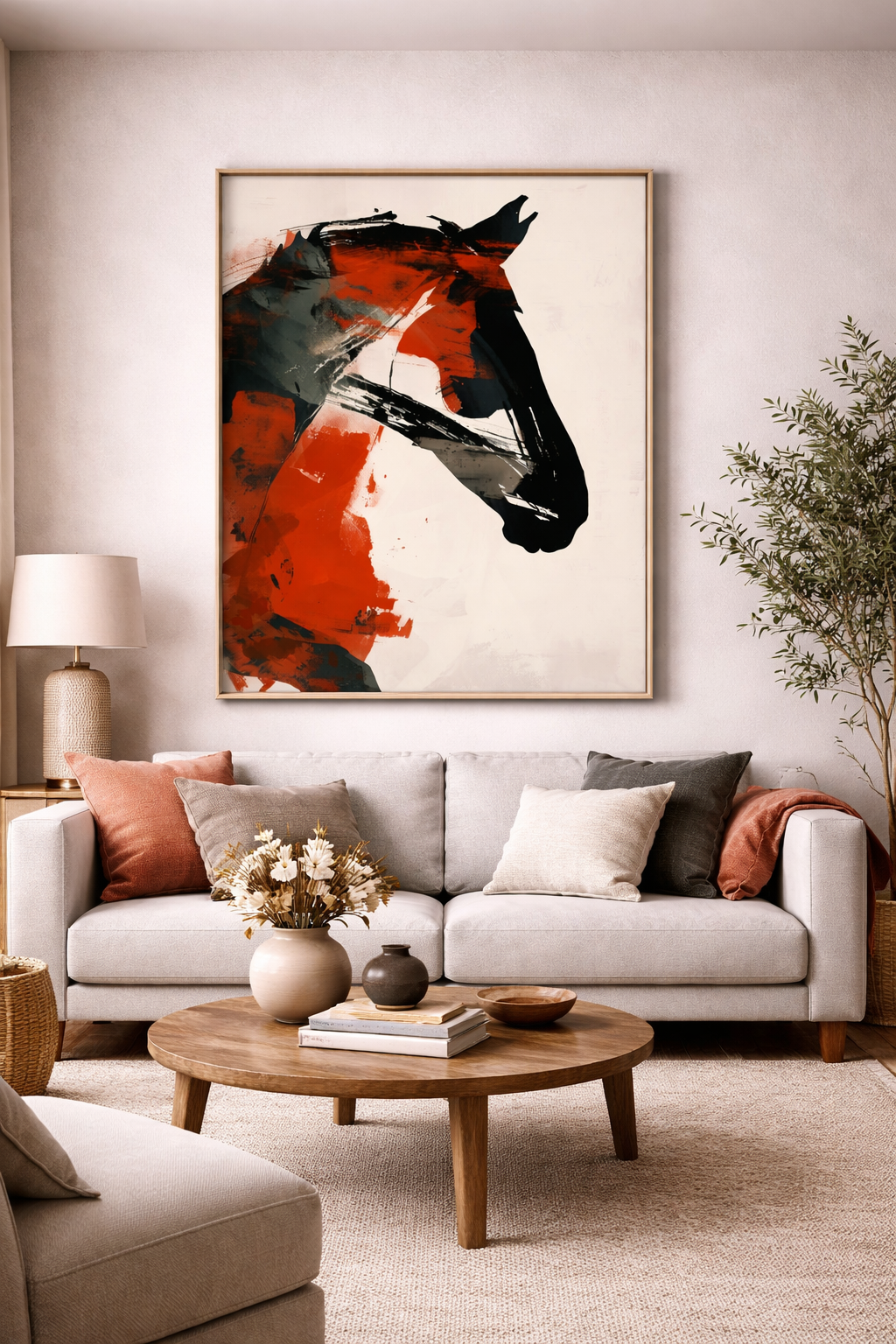 Cette œuvre contemporaine capture la force et la liberté du cheval à travers des touches abstraites aux teintes rouges, noires et naturelles. Le mouvement des formes et le contraste des couleurs créent une présence puissante et expressive, idéale pour dynamiser un intérieur moderne. Parfaite pour un salon ou un espace de caractère, Élan Sauvage apporte énergie, élégance et intensité artistique à votre décoration murale.
