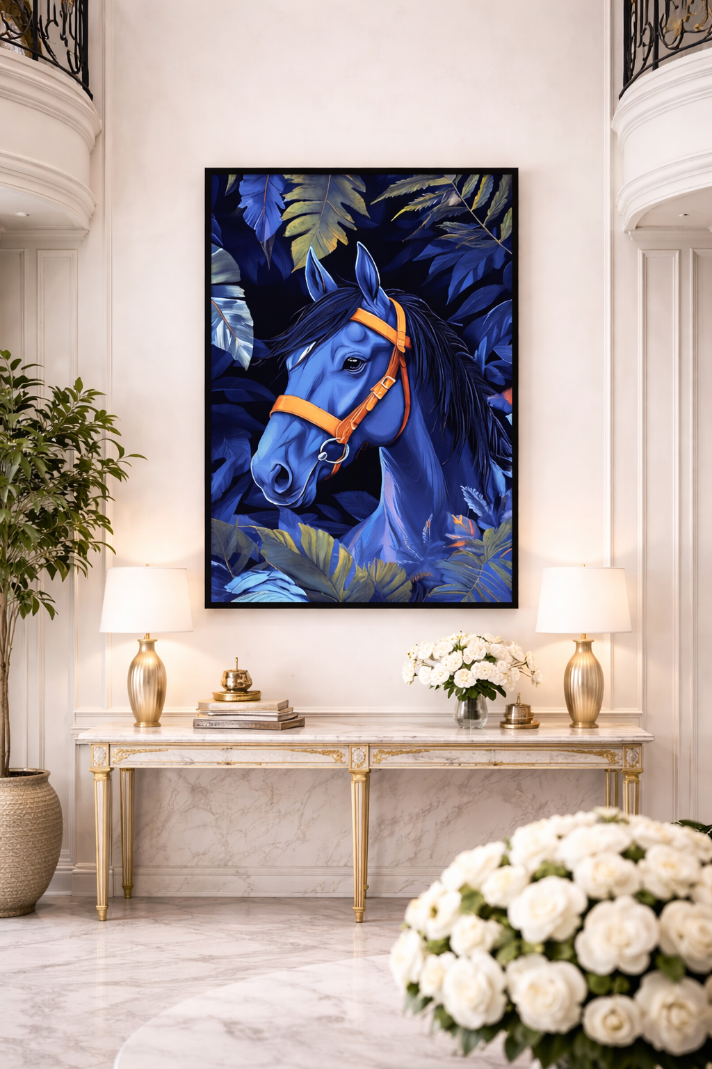 Cette œuvre saisissante met en scène un cheval majestueux aux nuances profondes de bleu, sublimé par des touches chaleureuses de cuir et un décor végétal luxuriant. L’alliance des couleurs intenses et du regard expressif crée une atmosphère à la fois puissante et raffinée. Idéale pour apporter caractère et élégance à un salon, un bureau ou un espace contemporain, Majesté Bleue devient une pièce forte qui attire immédiatement le regard.