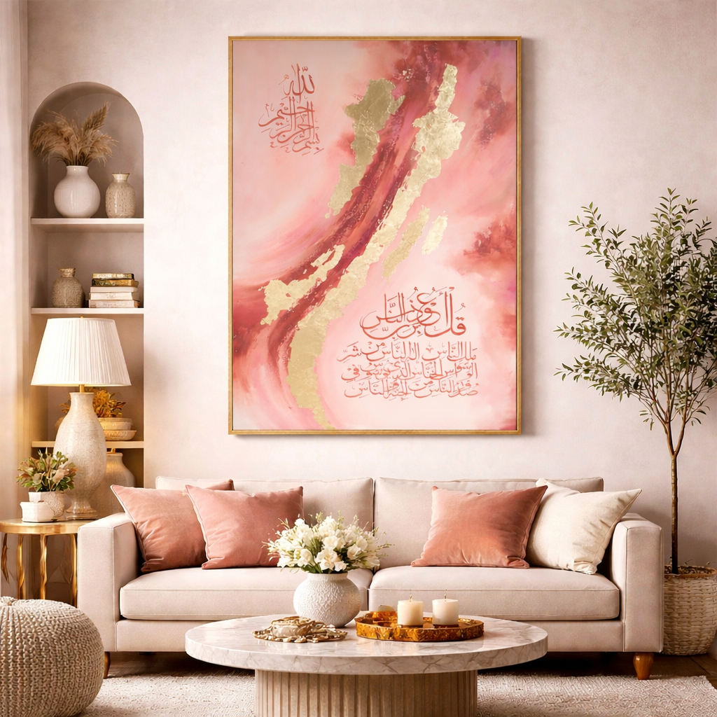 Ce tableau abstrait et élégant met en scène la calligraphie islamique des sourates "Al-Falaq" et "An-Nas" (قل أعوذ برب الفلق و الناس), souvent récitées pour la protection. La calligraphie est réalisée dans une teinte rouge-doré ou cuivrée, se détachant sur un fond abstrait et fluide. Ce fond est dominé par des nuances de rose, de rouge et de bordeaux, entrelacées avec des éclats et des traînées d'or métallique, créant un effet de mouvement et de richesse. L'œuvre est encadrée par un cadre noir simple et moderne, soulignant la beauté et la spiritualité de la composition. Ce tableau apporte une touche de sérénité et d'élégance contemporaine à tout espace.