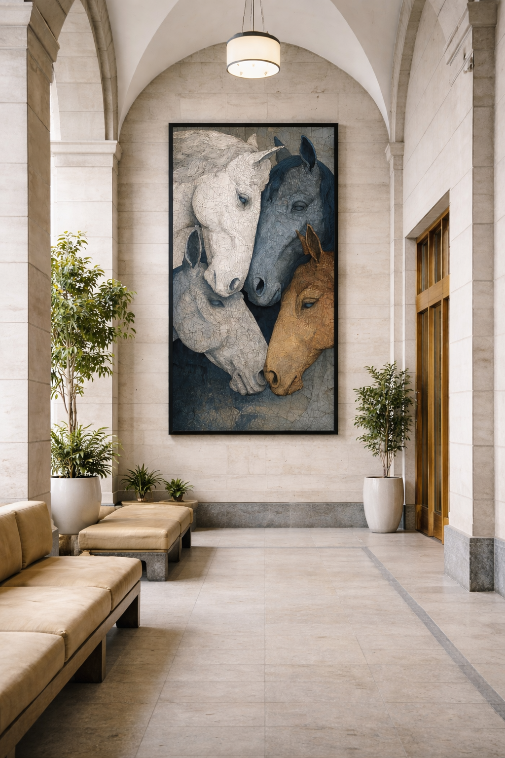 Cette œuvre majestueuse met en scène trois chevaux réunis dans un moment de calme et de complicité, symbolisant la force, l’unité et l’harmonie. Les textures raffinées et la palette douce de tons minéraux apportent profondeur et noblesse à la composition. Idéale pour un hall, un salon spacieux ou un lieu de prestige, Union Sauvage impose une présence artistique forte et intemporelle, sublimant l’espace avec élégance et caractère.