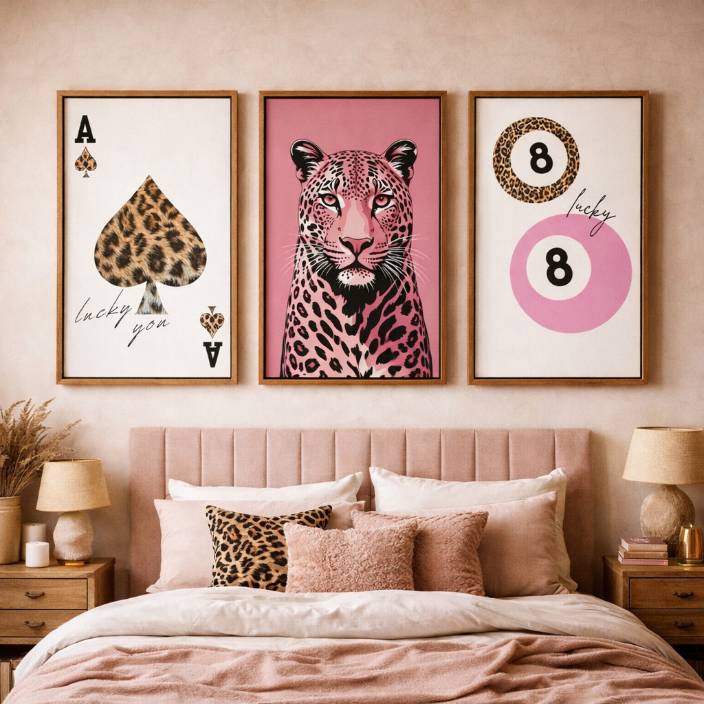 Affirmez votre style avec ce triptyque léopard aux accents rose et imprimé animal. Entre pop art moderne et touches glamour, cet ensemble mural apporte caractère, originalité et élégance à une chambre contemporaine ou un intérieur audacieux.