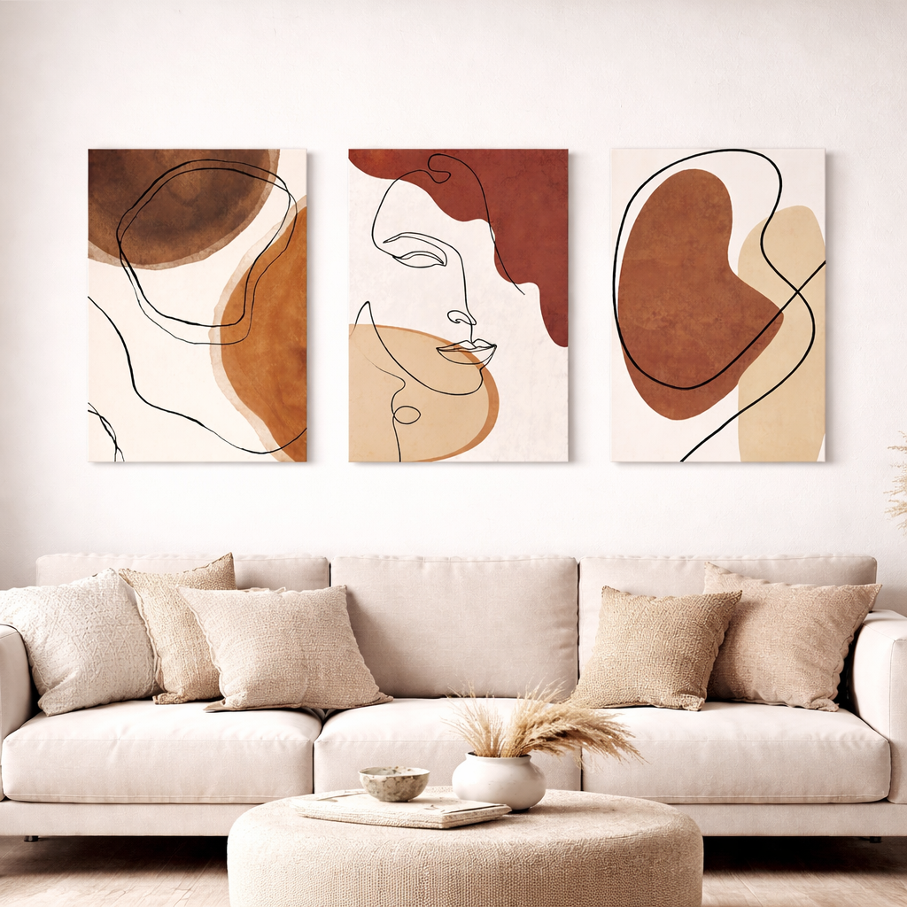 Apportez chaleur et élégance à votre intérieur avec ce triptyque abstrait aux tons terracotta et beige. Son design minimaliste aux lignes artistiques et formes organiques s’intègre parfaitement dans un salon moderne, une chambre contemporaine ou un espace bohème chic.
